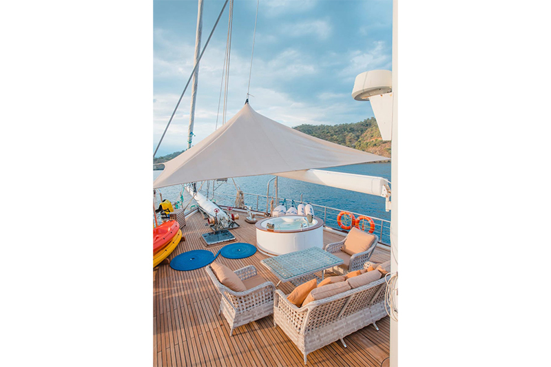 Ön güvertenin düz olması tur sırasında değişik aktiviteler ve eğlenceler için sizlere geniş alan yaratmaktadır. Dilerseniz bu alandaki şezlonglarda güneşlenebilir, dilerseniz ise salonun üzerinde yer alan güneş minderlerini kullanabililirsiniz.
