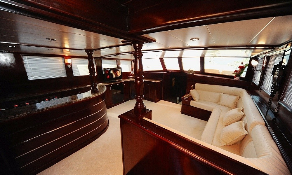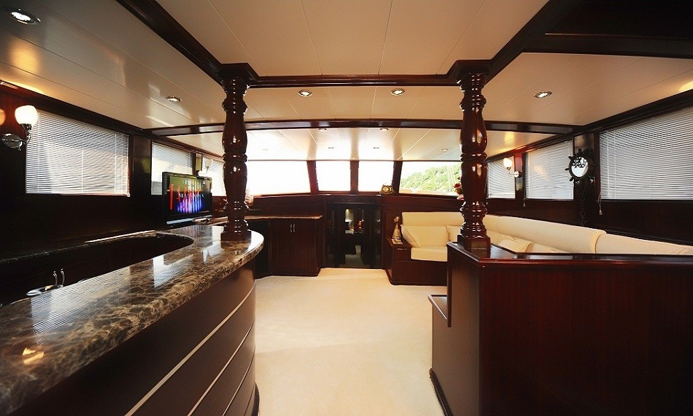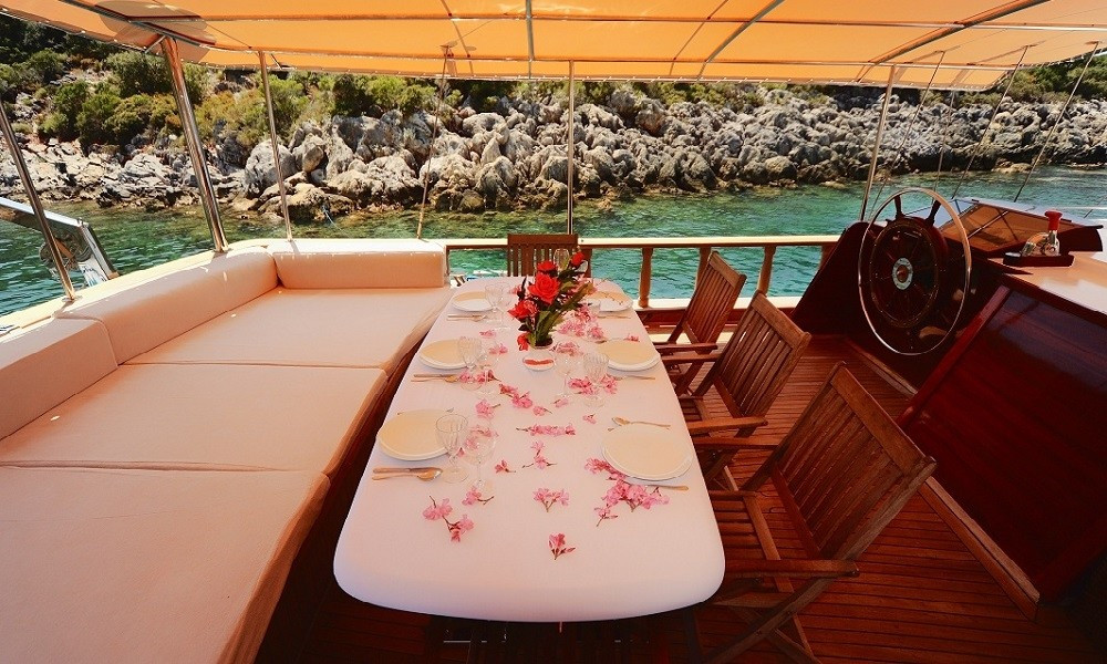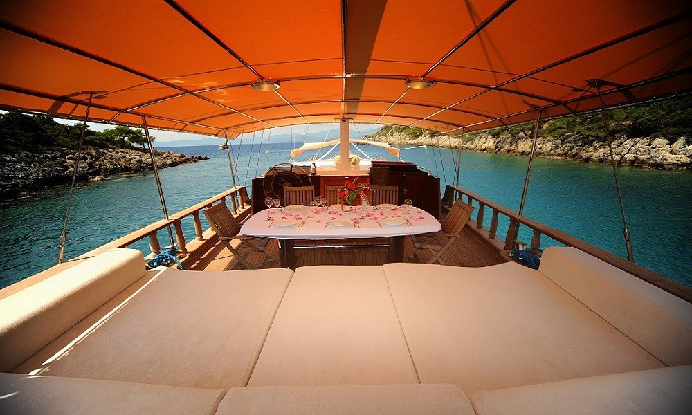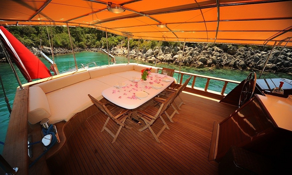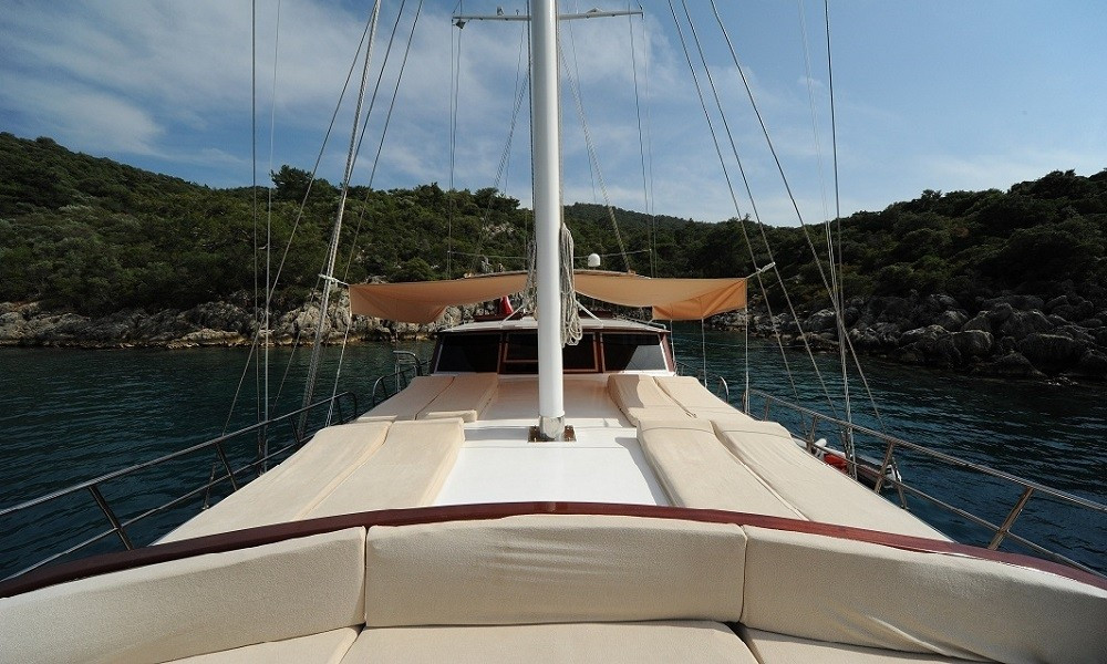 Zemin tik ağacı, arka güvertede yemek masası ve oturma alanı, ön güvertede oturma alanı ve masa, güneşlenme minderleri, deniz merdiveni, güvertede duş.